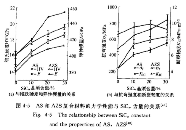 加入30%(體積分?jǐn)?shù))SiC、可使可從純Al1O的235MPa提高到634MPa。加入20%(體積分?jǐn)?shù))2Y-ZrO2顆粒可進(jìn)一步提高AS材料的抗彎強(qiáng)度,但此時SiCw的補(bǔ)強(qiáng)作用則遠(yuǎn)低于在AS材料中,而且在SiC、含量為20%(體積分?jǐn)?shù))時AZS材料的0達(dá)達(dá)最高值784MPa,隨隨后進(jìn)一步提高晶須含量反而下降A(chǔ)S和AZS材料料的斷裂韌度均隨SiC含量的增加而連續(xù)提高,并且AZS材料度Kc的提高幅度略大于AS材材料。